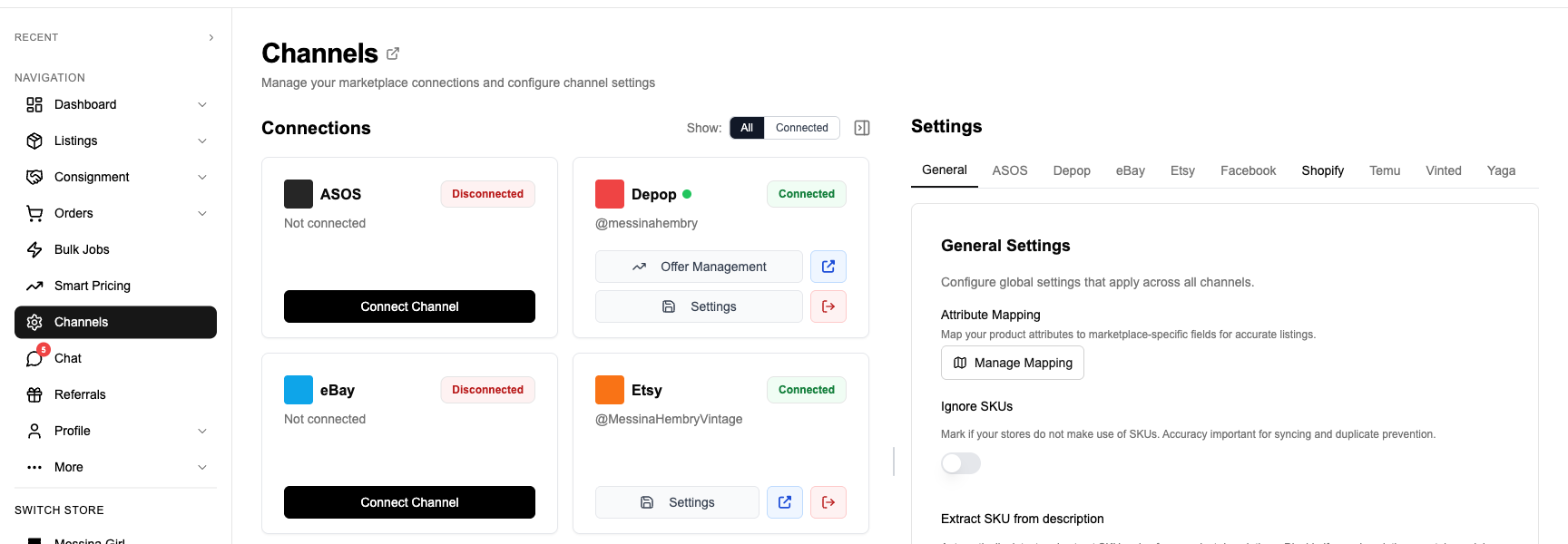 - Crosslist to and from Depop — Push Depop listings to eBay, Vinted, Shopify, and Facebook, or pull products from other platforms into Depop